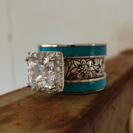 3pc Princess Cut Diamond Western Turquoise Wedding Ring with Slide Flower