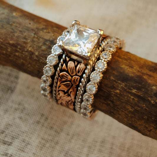 3pc Rose Gold Flower Square Diamond Western Promise Rings