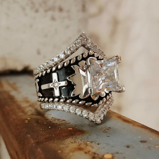 Western Cross Ring with Square Cut Stone – Vintage Gothic Cowboy Jewelry