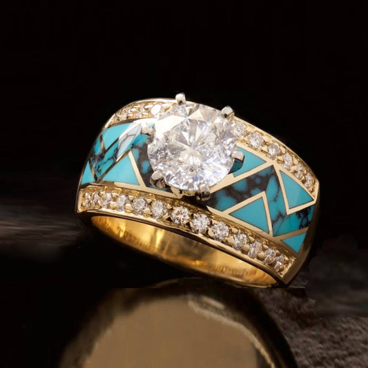 Western Diamond Sunflower Engraved Square Turquoise Engagement Rings