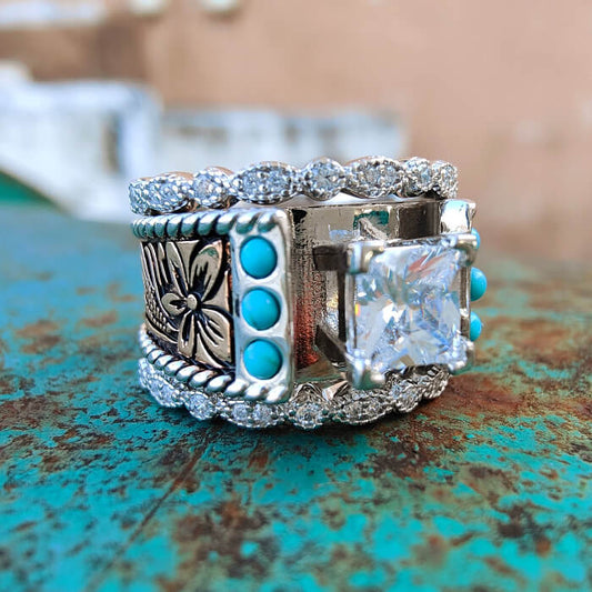 3pc Sterling Silver Flower Turquoise Western Diamond Ring