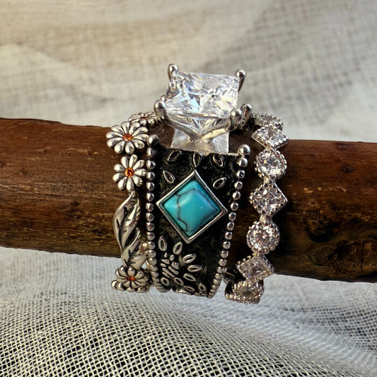 3pc Vintage Sterling Silver Square Turquoise Diamond Ring Set
