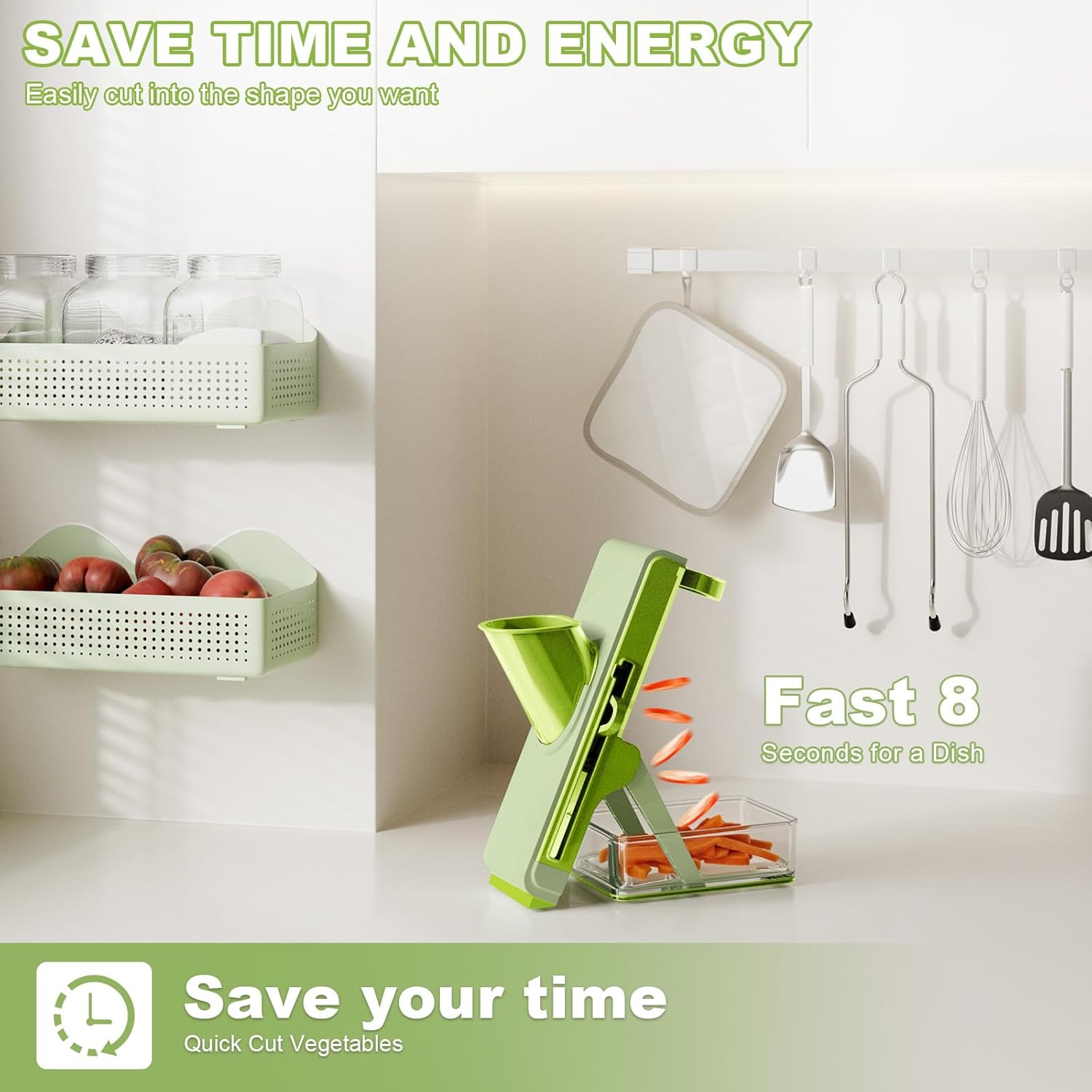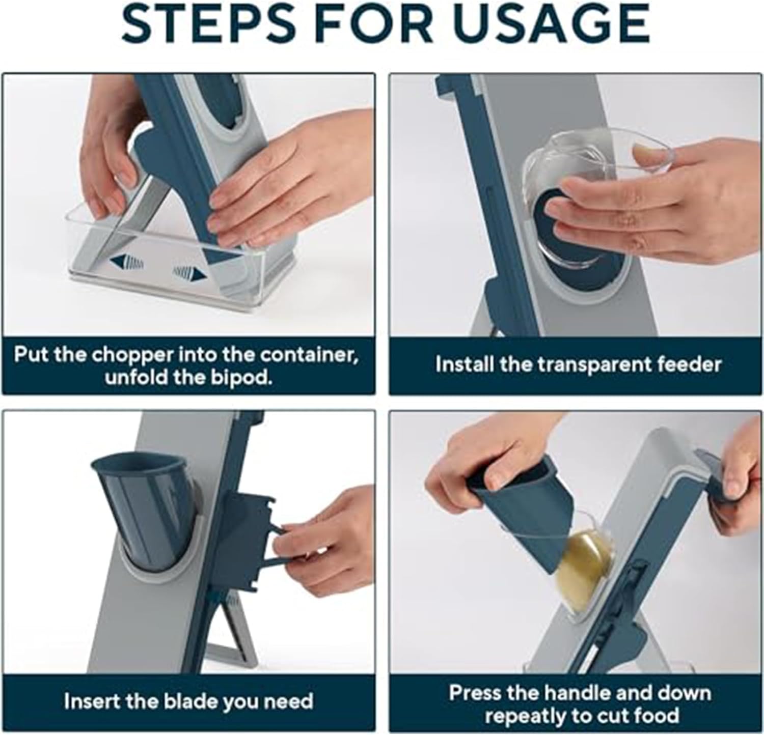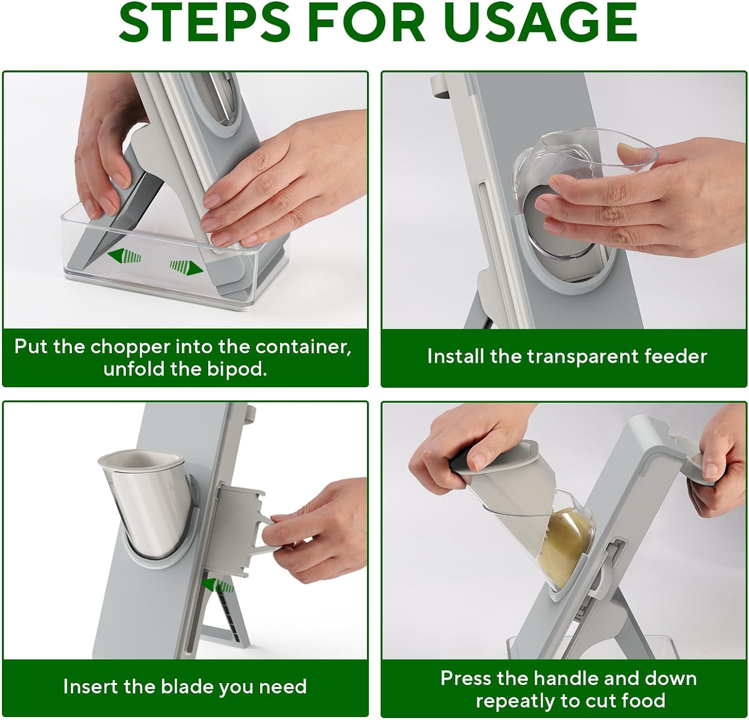 - 【Safety and High Quality】Our mandoline slicer for the kitchen has a shell made of eco-friendly ABS. The built-in stainless steel blade is strong and durable. You don't need to touch the blade, offering better protection for hand safety. Our vegetable chopper's non-slip silicone base and tripod design make it more stable.