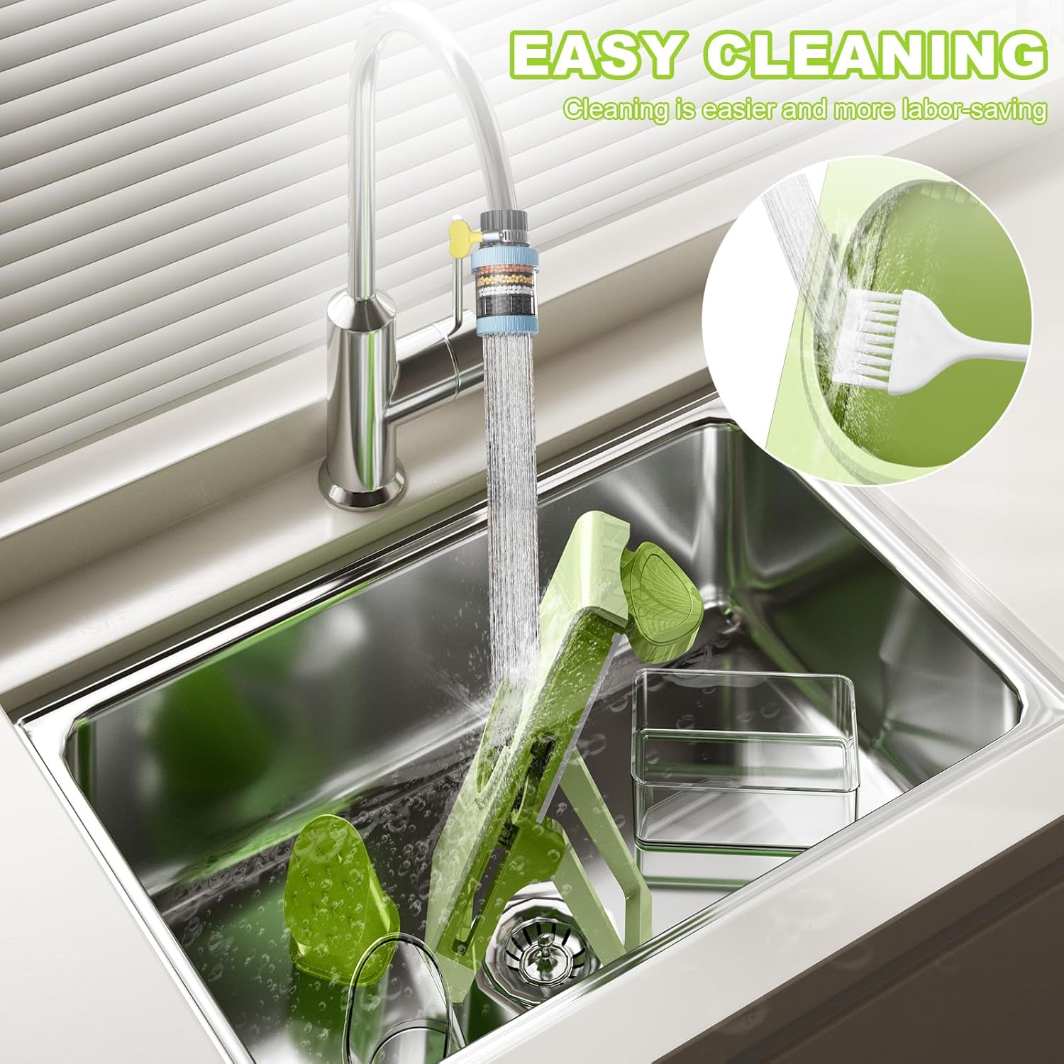 - 【Detachable & Easy to Clean】Our veggie chopper can be folded with one button for quick storage. The components can be separated for quick cleaning. The cleaning brush included with the potato slicer can easily remove food residues and can also be safely cleaned in the dishwasher.