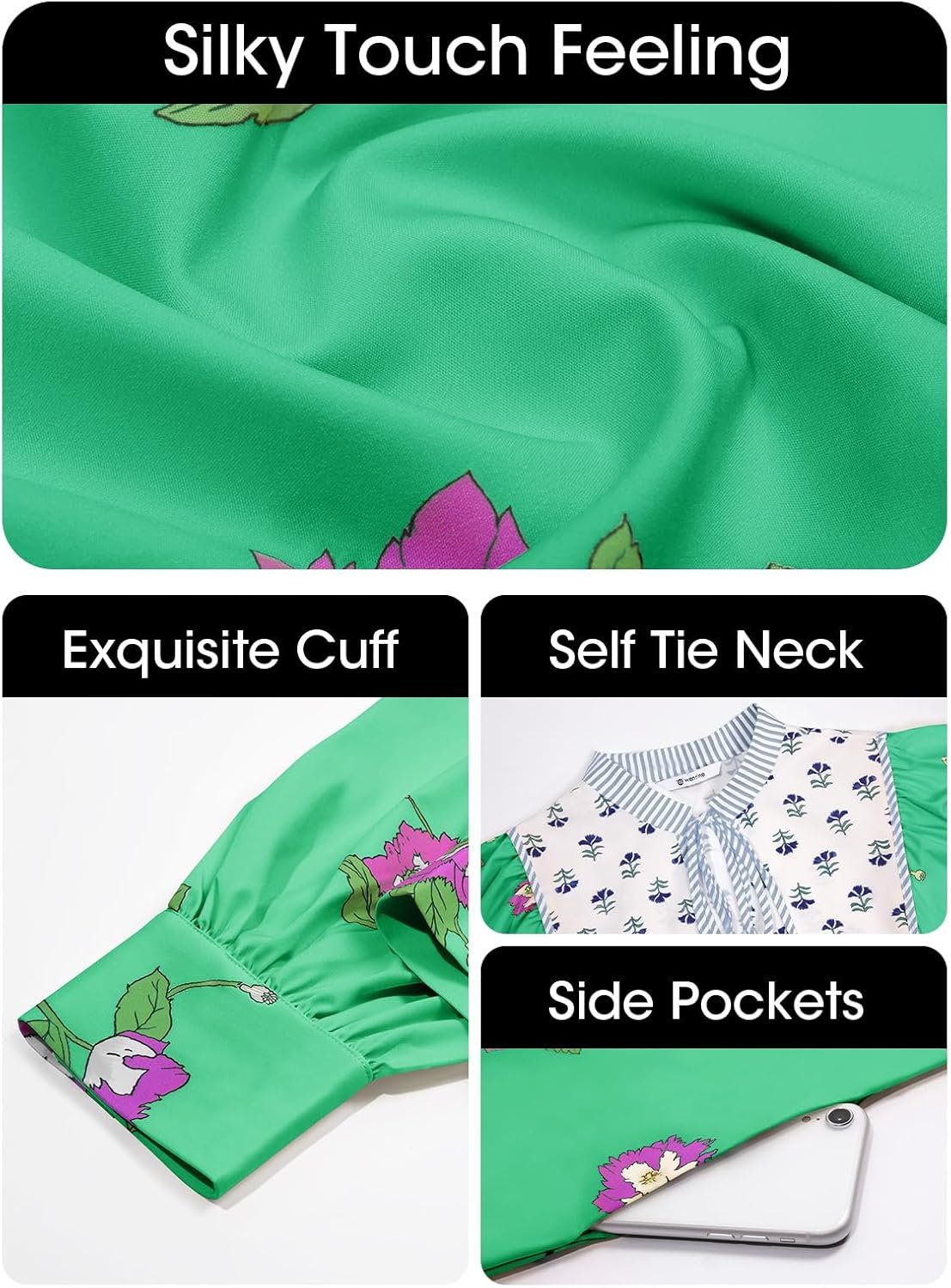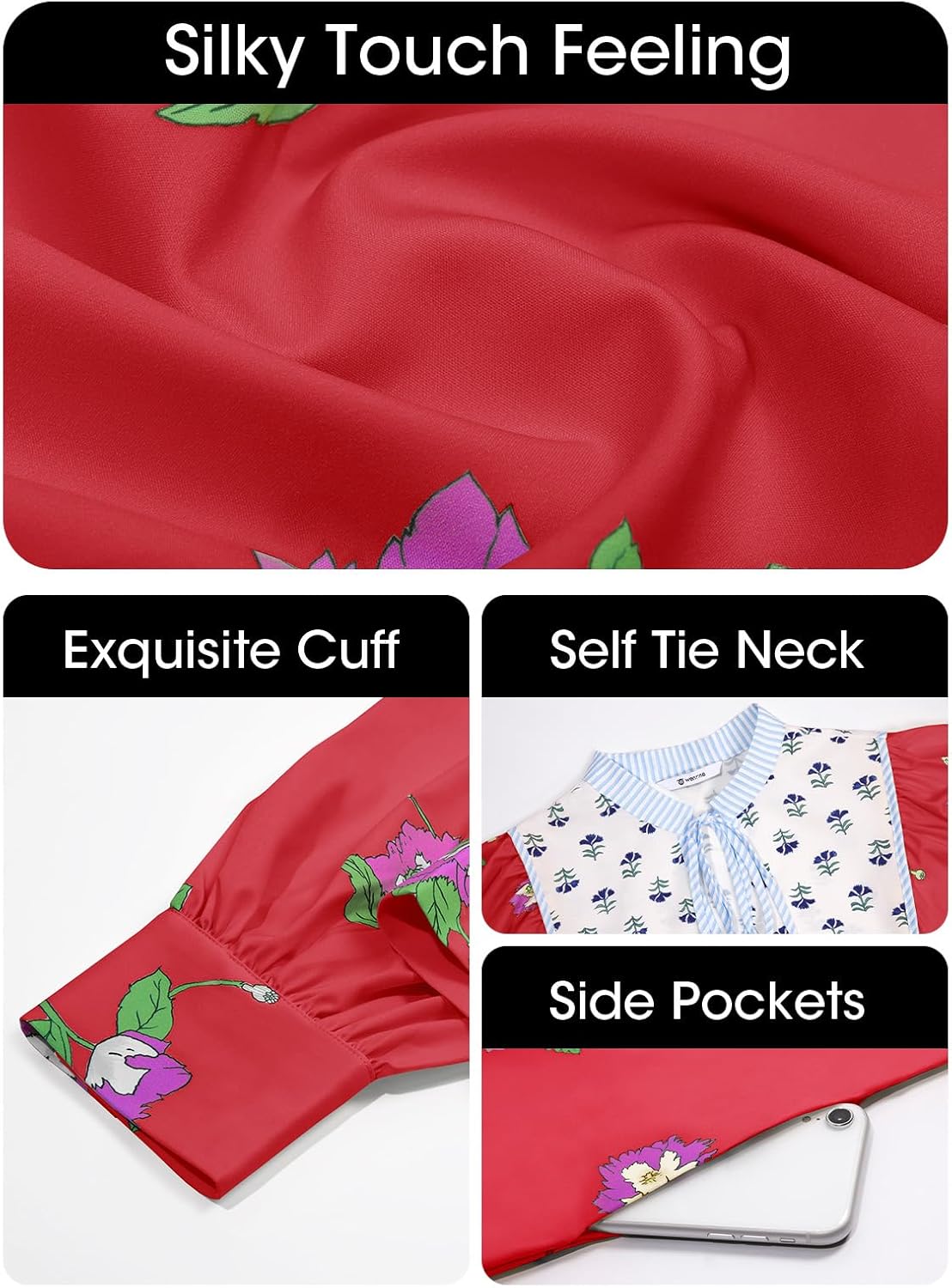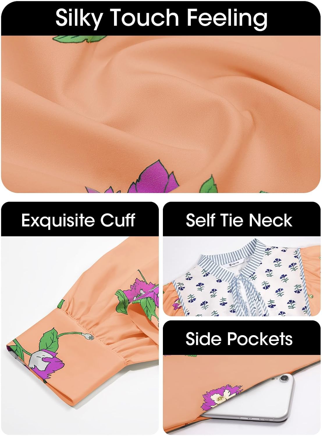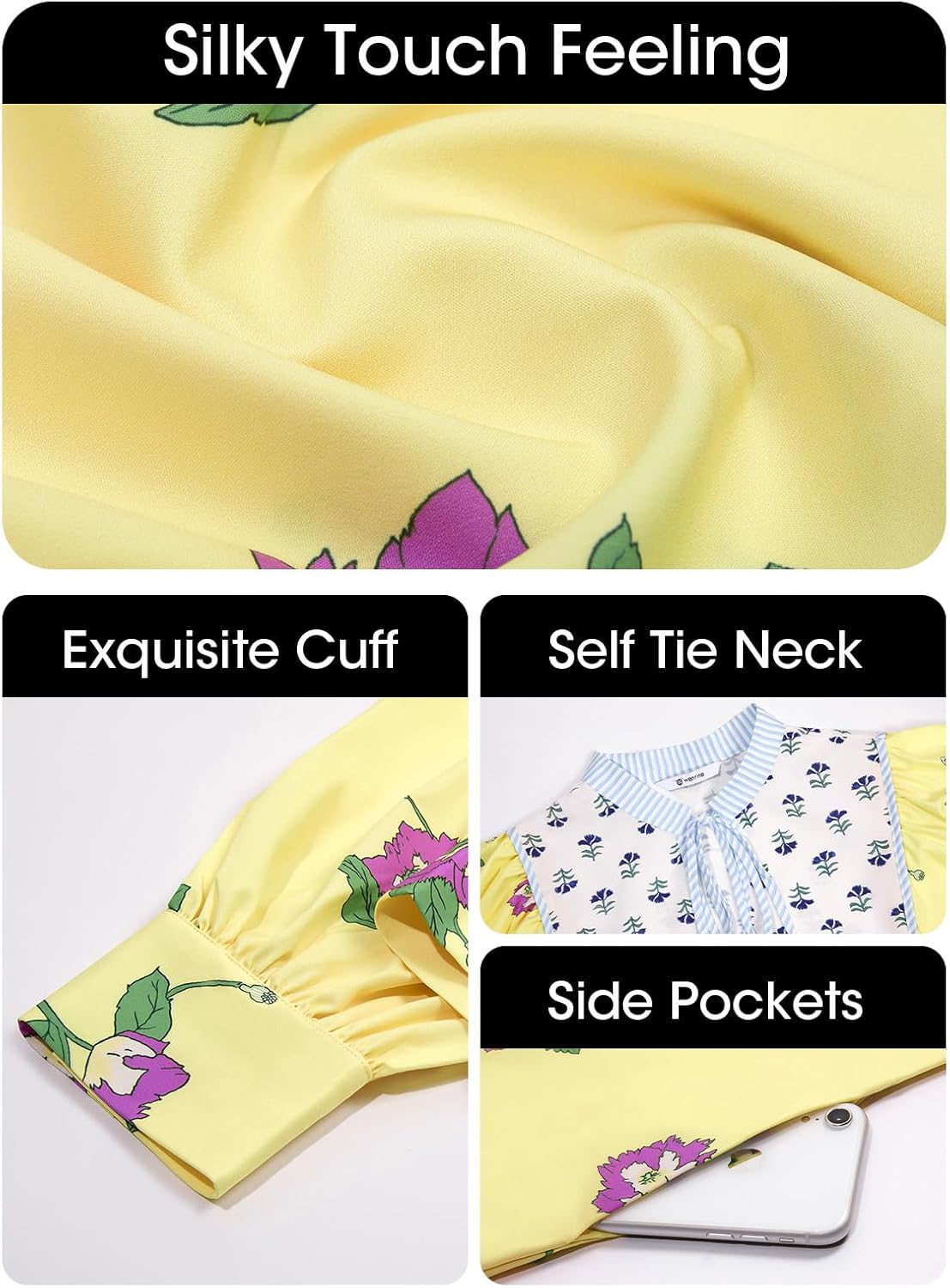 - Feature: Floral print, puff long sleeve, v neck, contrast color, patchwork, self tie, loose, side pockets, button cuff, short length; Mini dress, summer spring fall fashion dress, bohemian dress, boho dress, casual dresses, beach dress, shift dress